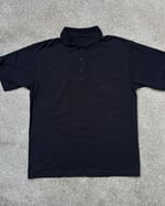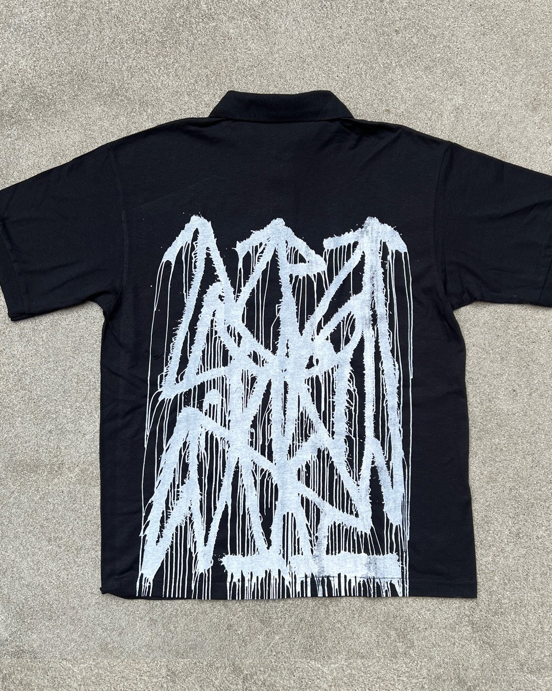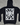 Hand printed on the back in white and embroidered in black on the front bottom right.