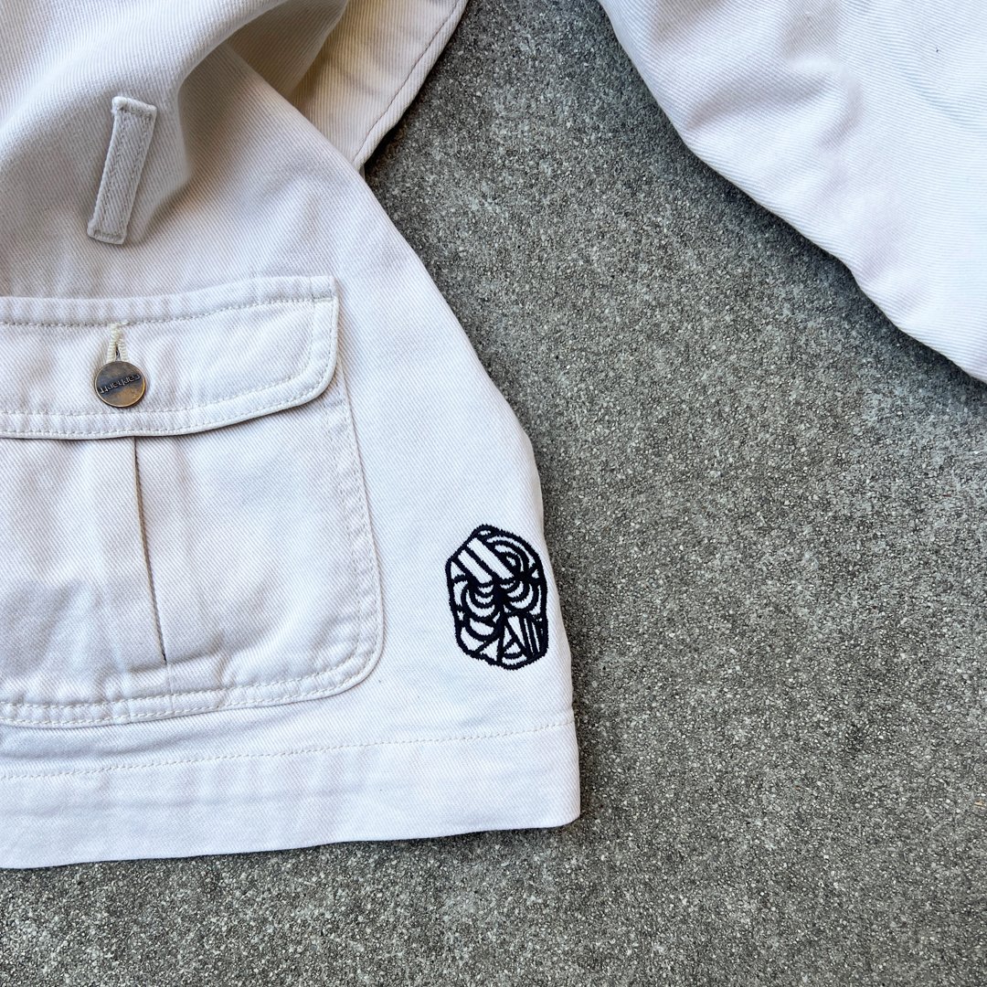 stampa sul retro in serigrafia + ricamo frontale e etichetta interna cucita